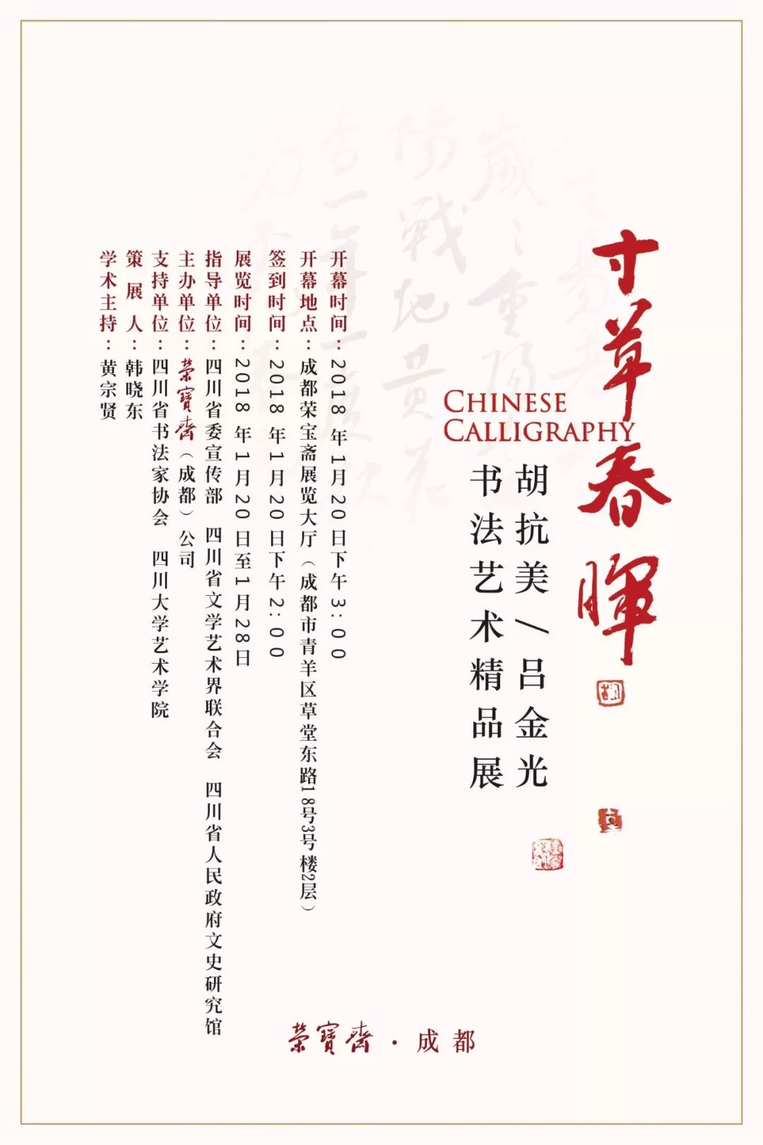 1月20日,由四川省委宣传部、四川省文学艺术界联合会、四川省人民政府文史研究馆指导,荣宝斋(成都)公司主办的“寸草春晖”胡抗美、吕金光书法艺术精品展在成都荣宝斋展览大厅顺利举行。