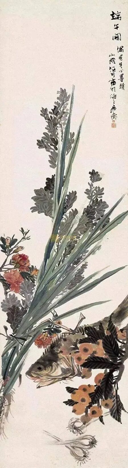 画面中都是端午节的应景节物,有“天中三瑞”——菖蒲、艾草和蒜头,以及端午食俗风物。任颐是浙江省绍兴人,画中特也展现了江浙一带端午节吃黄鱼的风俗。