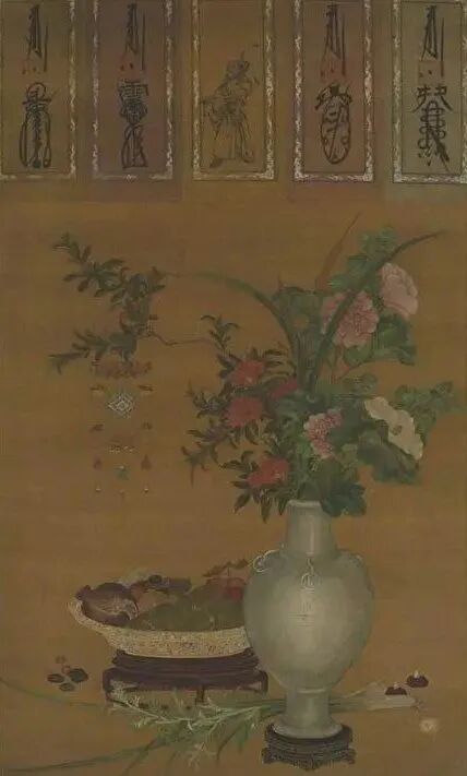 “天中”是五月初五端午节别称,题名“天中佳景”是为端午的应景画。这幅传为元人《天中佳景》的帛画的构图很像“瓶插”花卉画的构图方式。瓶中插著蜀葵、石榴花和水蜡烛,朵朵盛开,石榴梢系着精致的香囊,表现端午风俗民情。