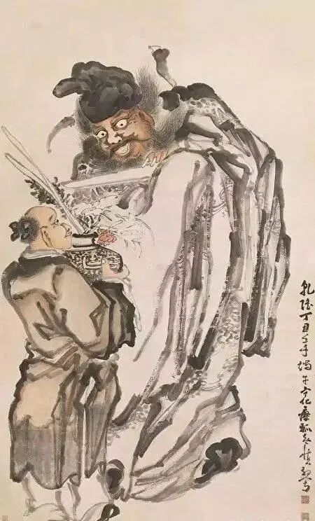 清代黄慎画的这幅中,我们看到钟馗正与童子嬉耍,捉弄童子。钟馗脸部表情丰富,完全是一种戏剧性的夸张。黄慎以精到的力度,带着飞白意味的,浓淡枯润皆宜的笔法把钟馗身上的衣袍席卷似地画将下来,宛然成了一座雄浑的山,这种看似粗略,其实颇为厚重且连绵富变化的手法,正好和钟馗的性格以及他在民俗中“镇邪”的特性相搭配,相得益彰。而画中的童子,手里捧著艾草、菖蒲等端午节物,表情微带奉献的欢喜意味。