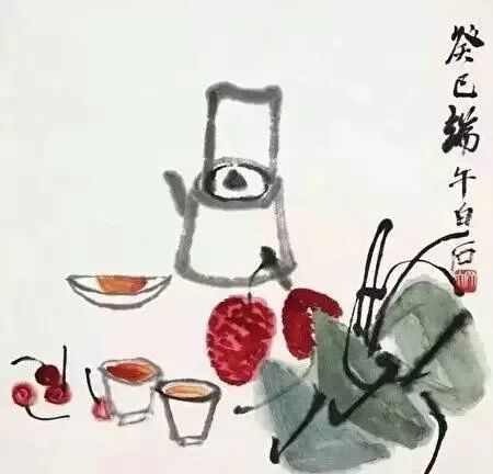 其它还有荔枝、樱桃、剖开见蛋黄的咸蛋。还有一壸茶(或许是雄黄酒)和杯子。雄黄酒、咸鸭蛋都是江浙人的端午“五黄餐”的养生食物。养生的白石老人把端午时节所能享用的美食铺陈在纸面上,意态悠然,没有考究,不讲细节,只是自自然然地把它们画了出来。然而,以白石老人的功力,那真的是“下笔如有神”,充满了变化,布满了生机。