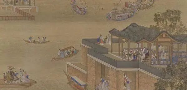 在观景台里面,我们可看到满清王朝家族大团聚,一边兴味盎然欣赏河面上的龙舟赛,一边欢聚交谊共享美好的端午佳节。按乾隆皇帝《端阳节观龙舟》诗所言“按队龙舟原不竞,虽嬉意欲化民淳”,清宫的龙舟竞渡意不在竞争,而在于透过这一活动,教化善良淳朴的民风。是呀!悼念爱国的三闾大夫屈原,谁人不想起那忠贞高贵的心灵!